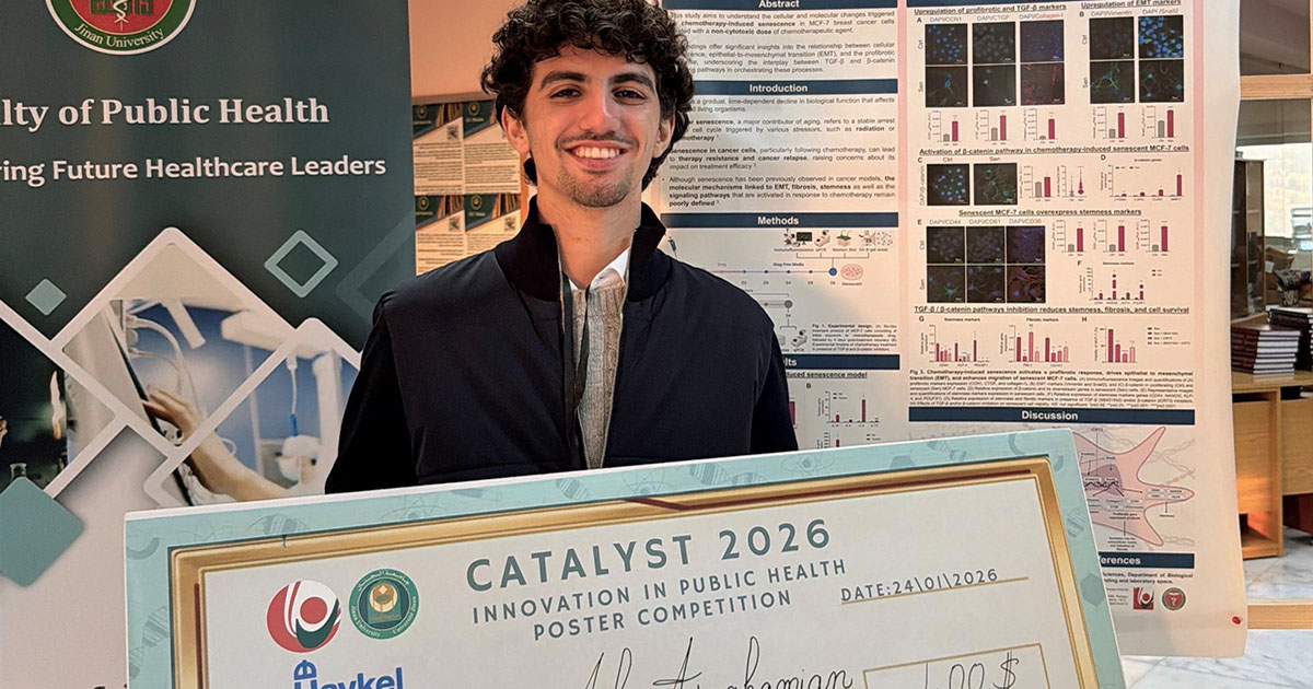 LAU’s School of Arts and Sciences is proud to announce that Alex Aprahamian (BS ’25) has won the first prize for Poster Competition: Catalyst 2026, Innovation in Public Health. Jointly organized by the Lebanese University and Jinan University, the competition saw Aprahamian present the senior/capstone project he worked on under the supervision of Assistant Professor of Biology Mohamad Rima. Aprahamian is currently enrolled in the Gilbert and Rose-Marie Chagoury School of Medicine.